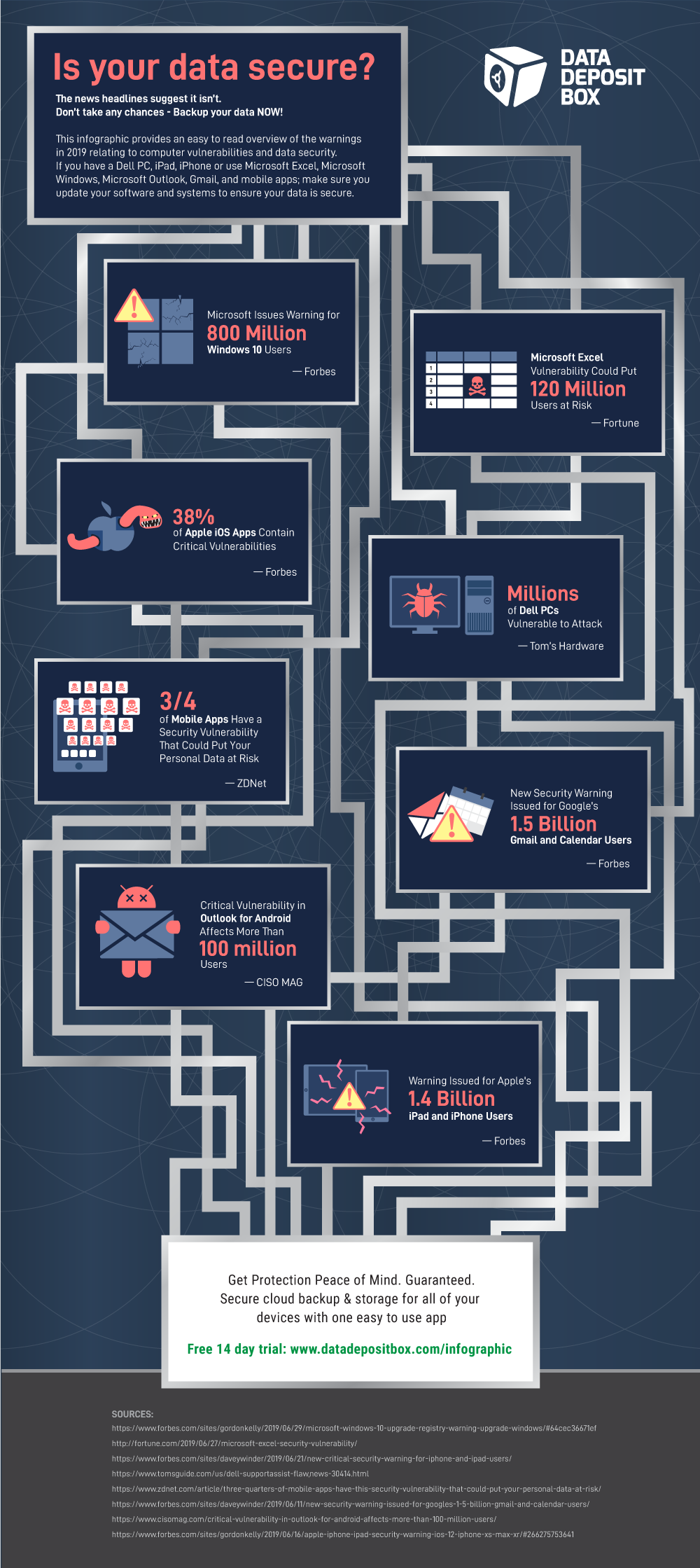 This infographic provides an easy to read overview of the warnings in 2019 relating to computer vulnerabilities and data security. If you have a Dell PC, iPad, iPhone or use Microsoft Excel, Microsoft Windows, Microsoft Outlook, Gmail, and mobile apps; make sure you update your software and systems to ensure your data is secure.
